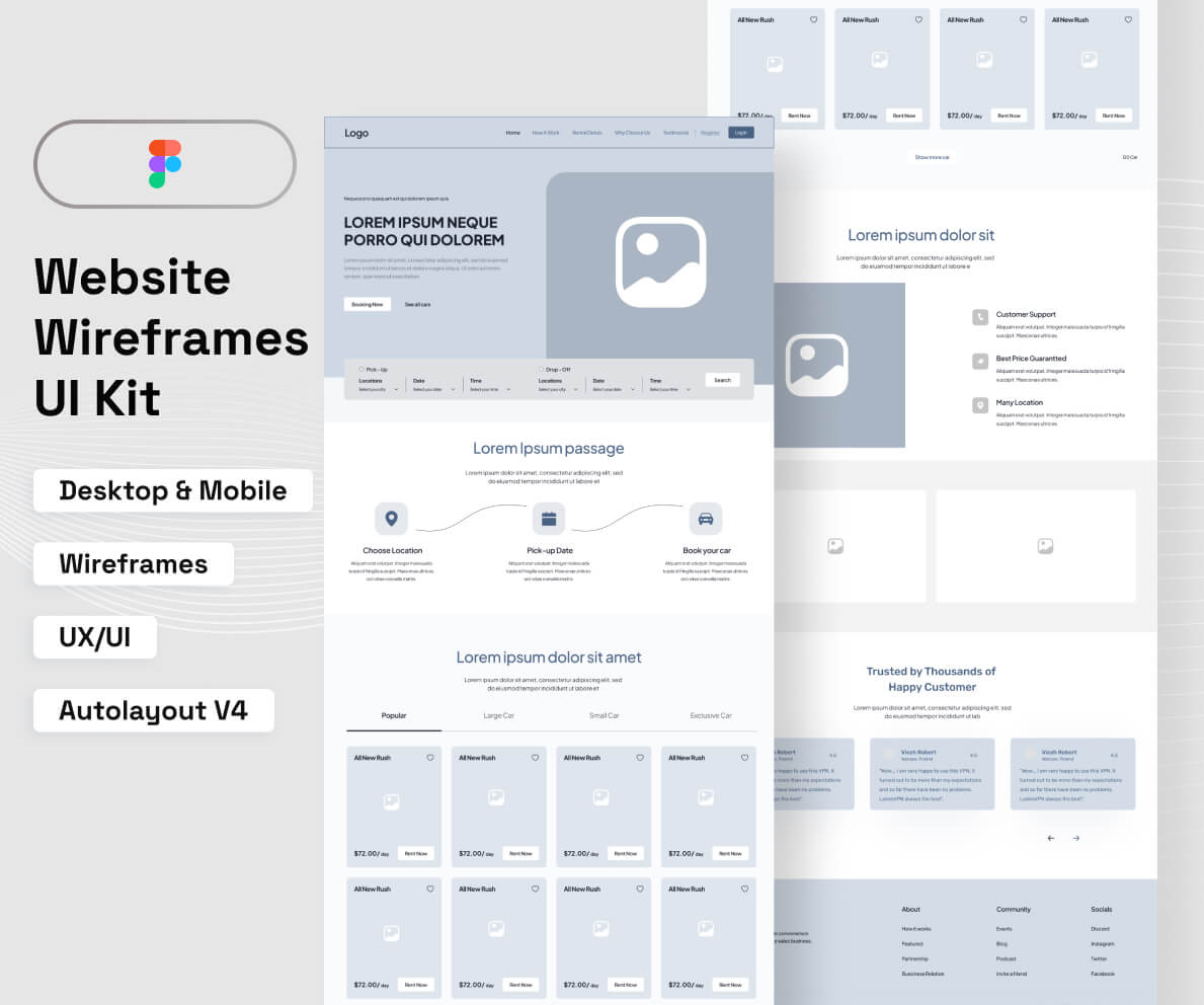 The high-fidelity user interface for a car rental platform is represented by this wireframe, which is intended to provide smooth booking processes…