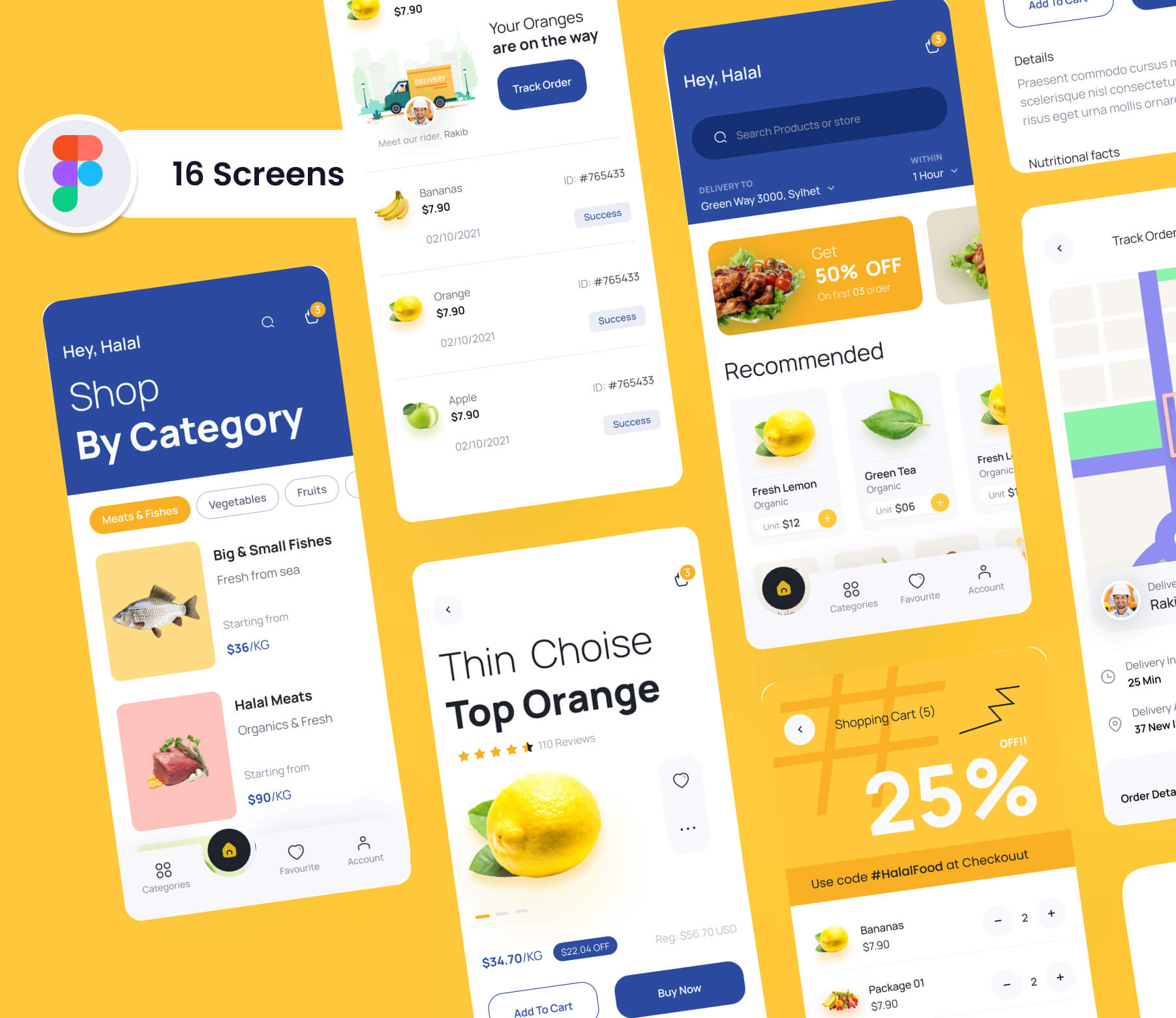 Presenting a clean and modern Grocery Shop Mobile App UI with 16 beautifully crafted screens.